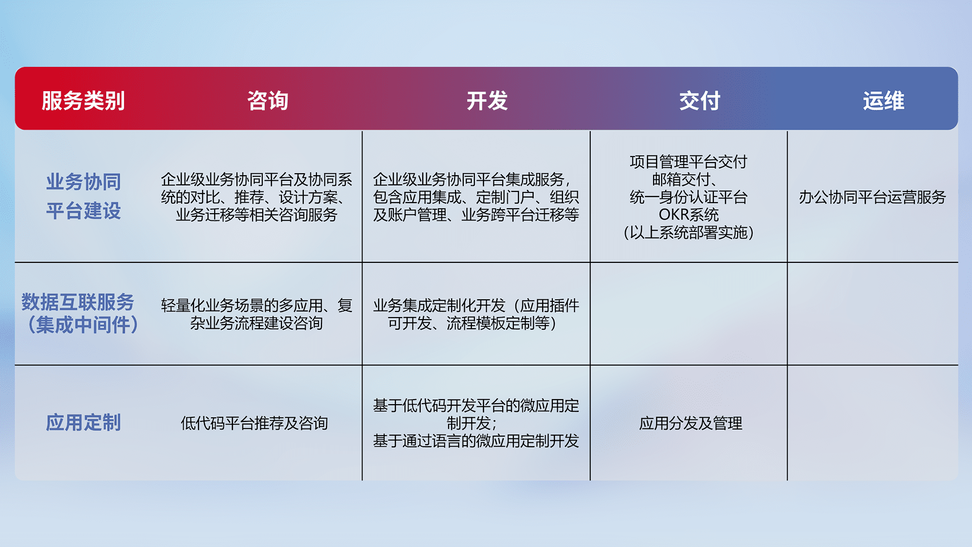针对钉钉、、、企微、、、、IDaas等平台级产品提供产品的规划、、方案、、、、交付、、、、定制化开发等服务,,实现如统一协同办公、、、智能客户服务、、、、混合会议管理、、智能数据查询、、等业务场景,,,,实现数字化转型。。
