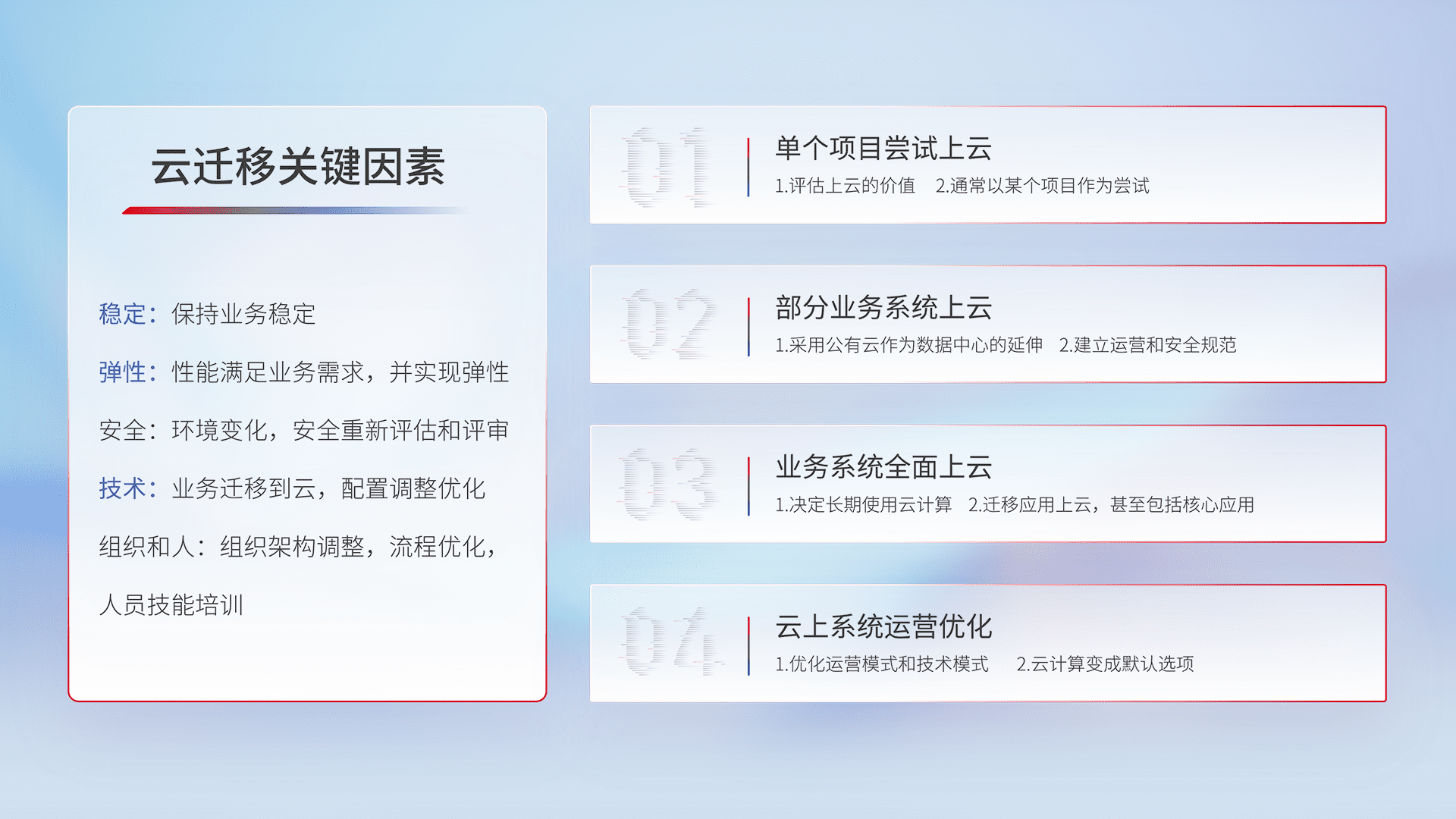 结合实际业务,,,,从规划设计、、、云平台选型、、、云原生改造、、数据迁移、、集成交付,,,,迁移全过程为客户识别最佳上云路径,,,,做好风险识别管理,,,设计网络架构、、、身份权限、、安全审计合规、、、、操作审计、、、、日志审计、、监控告警策略、、多站点容灾设计等,,,对云上基础设施进行整体规划,,提升IT治理水平,,以满足弹性、、、高可用、、、高性能的需求。。